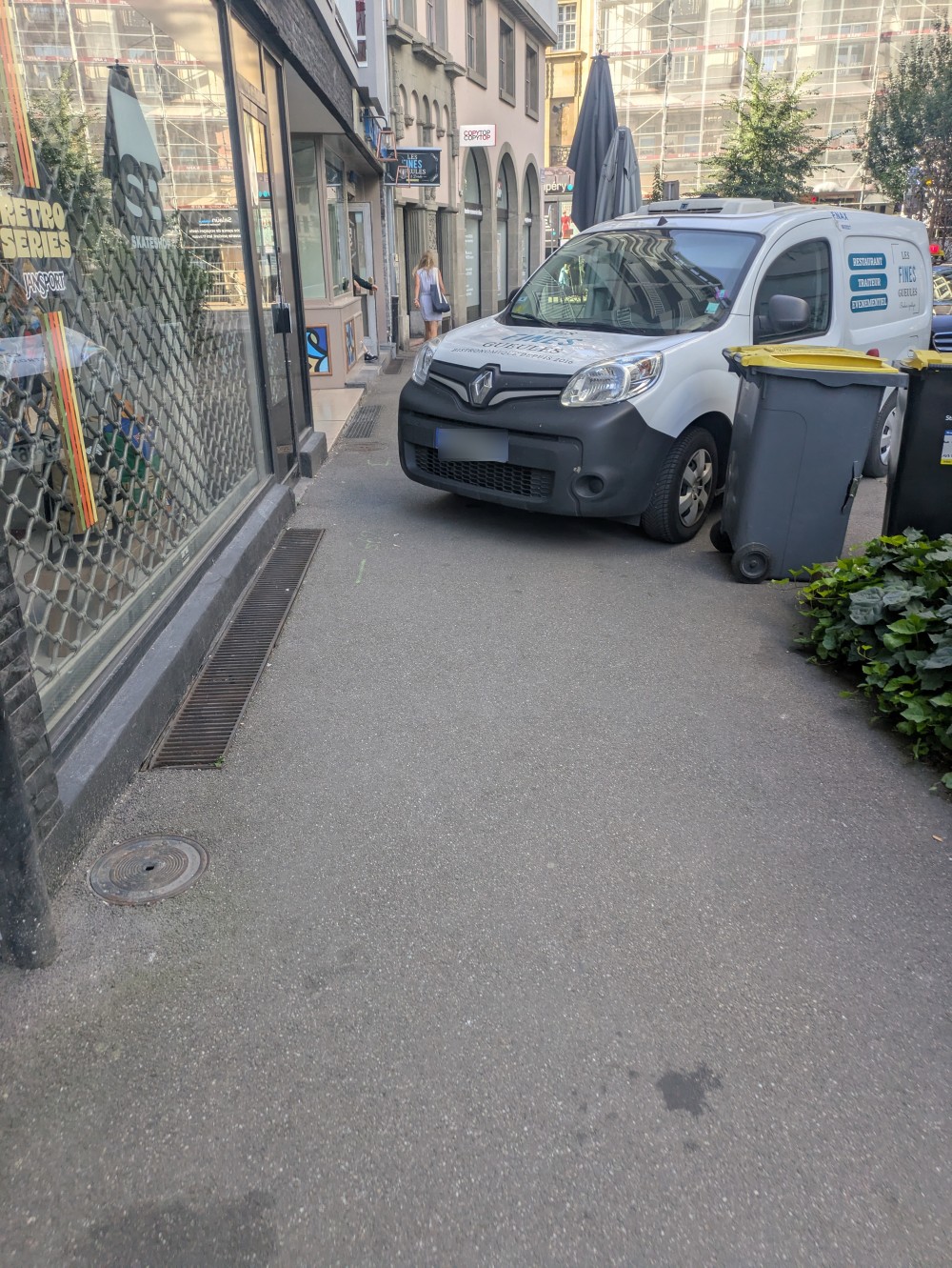 Voitures stationnées partiellement, voire complètement sur les trottoirs, scooters et motos en infraction (quasiment jamais verbalisés), vélos et trottinettes bloquant le passage, terrasses débordantes, panneaux de signalisation de travaux ou d’interdiction de stationner posés sur les trottoirs, poubelles des particuliers … Sans oublier les potelets anti-stationnement qui réduisent encore la place disponible pour les piétons et les personnes à mobilité réduite.