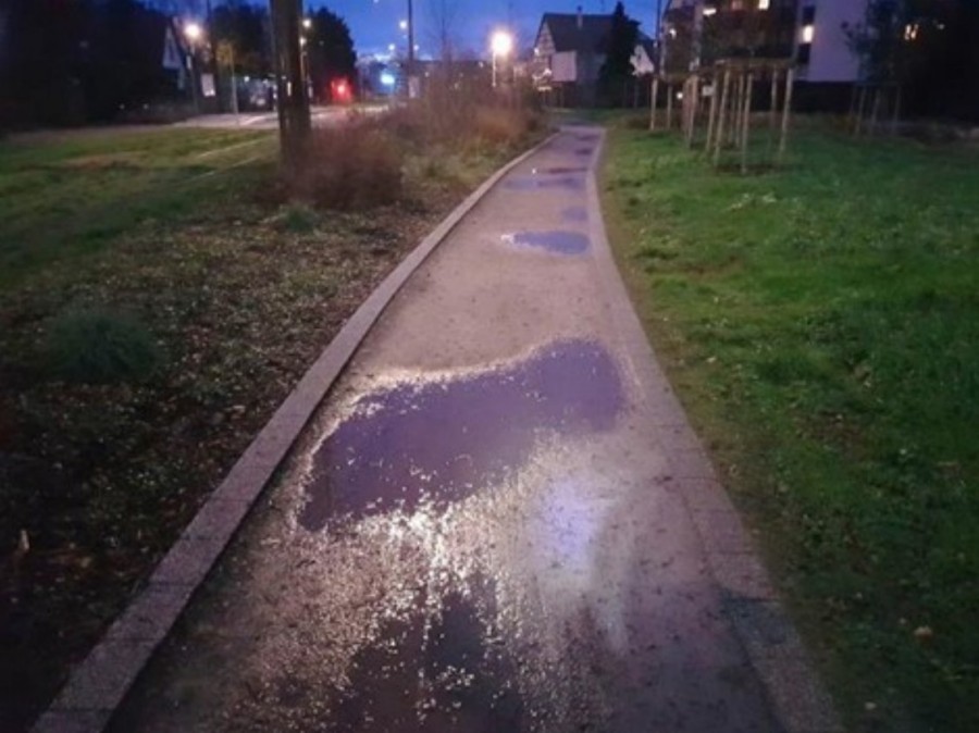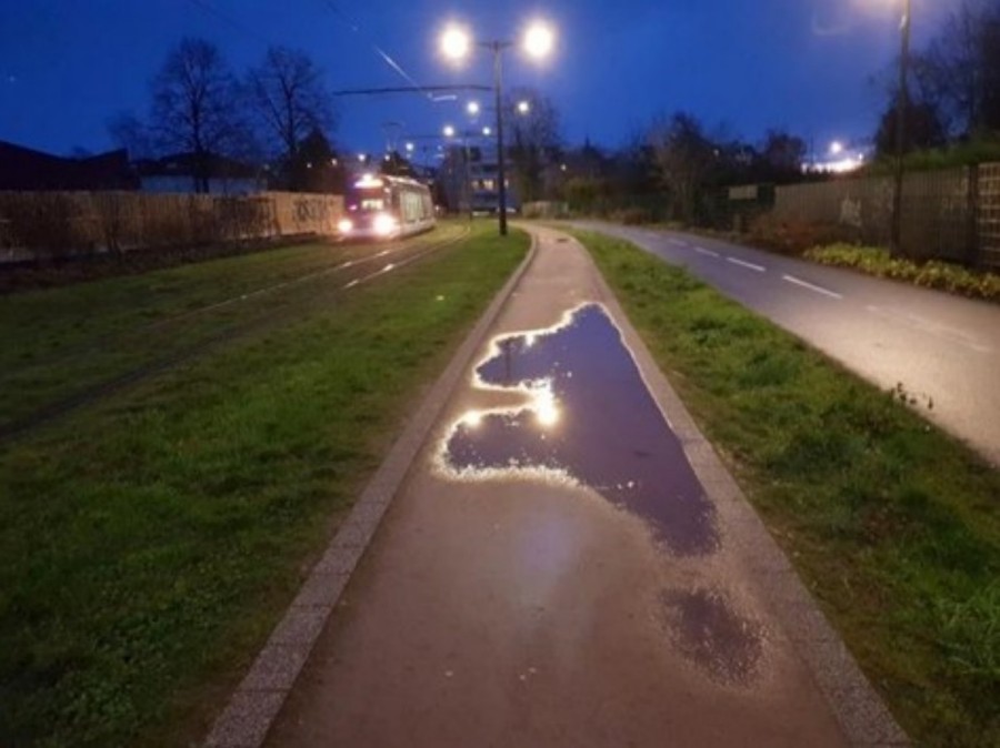 Flaques d'eau sur le cheminement piétons réalisés le long de la nouvelle extension tram de la Robertsau en stabilisé