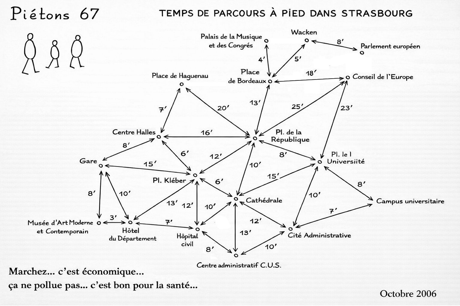 Notre association a innové en réalisant un plan schématique indiquant les temps de parcours moyens à pied entre les principaux pôles (places, bâtiments, monuments, etc.) de la ville de Strasbourg.